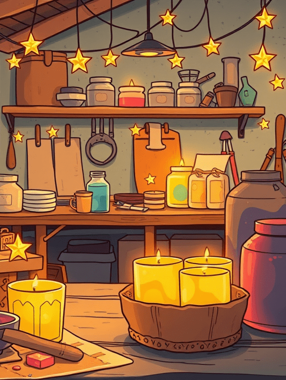 Ein Blick hinter die Kulissen meiner Werkstatt: Handgemachte Duftwachs‑Sets aus nachhaltigem Sojawachs, verziert mit funkelnden Glimmersternen.