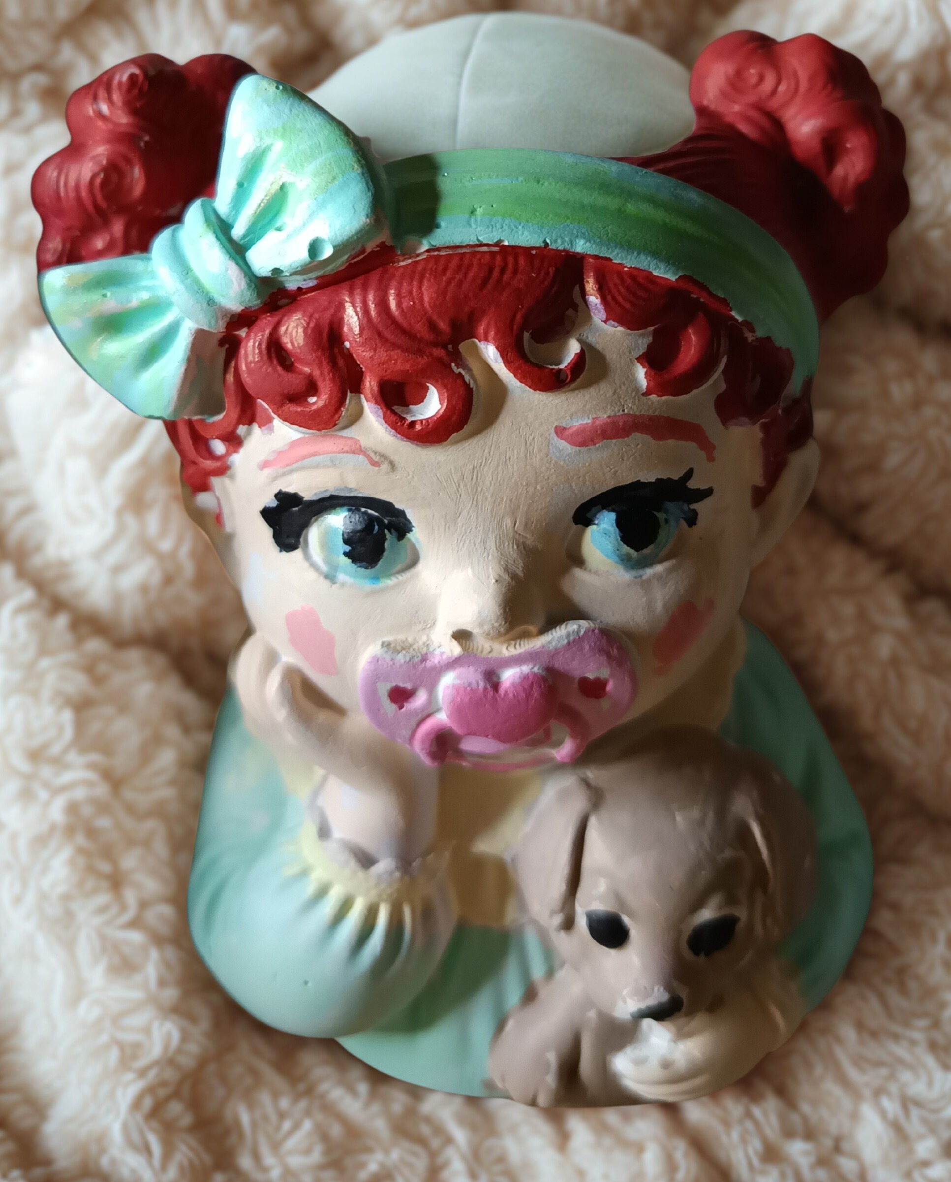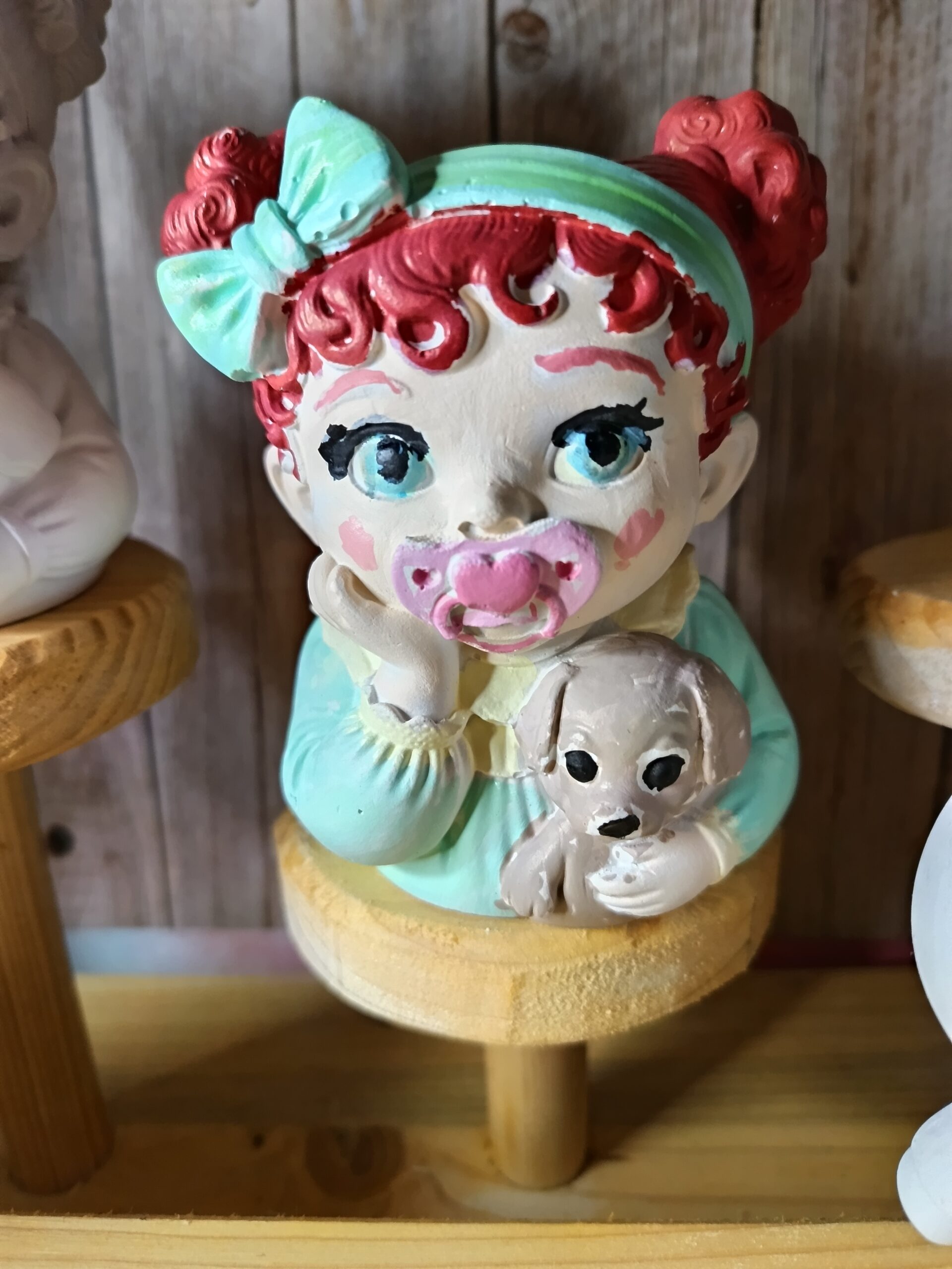 Die Figur zeigt ein liegendes Baby‑Mädchen mit Schnuller, das sich mit einer Hand abstützt und im anderen Arm einen kleinen Hund hält – ein liebevolles Motiv, das sofort Wärme ausstrahlt.