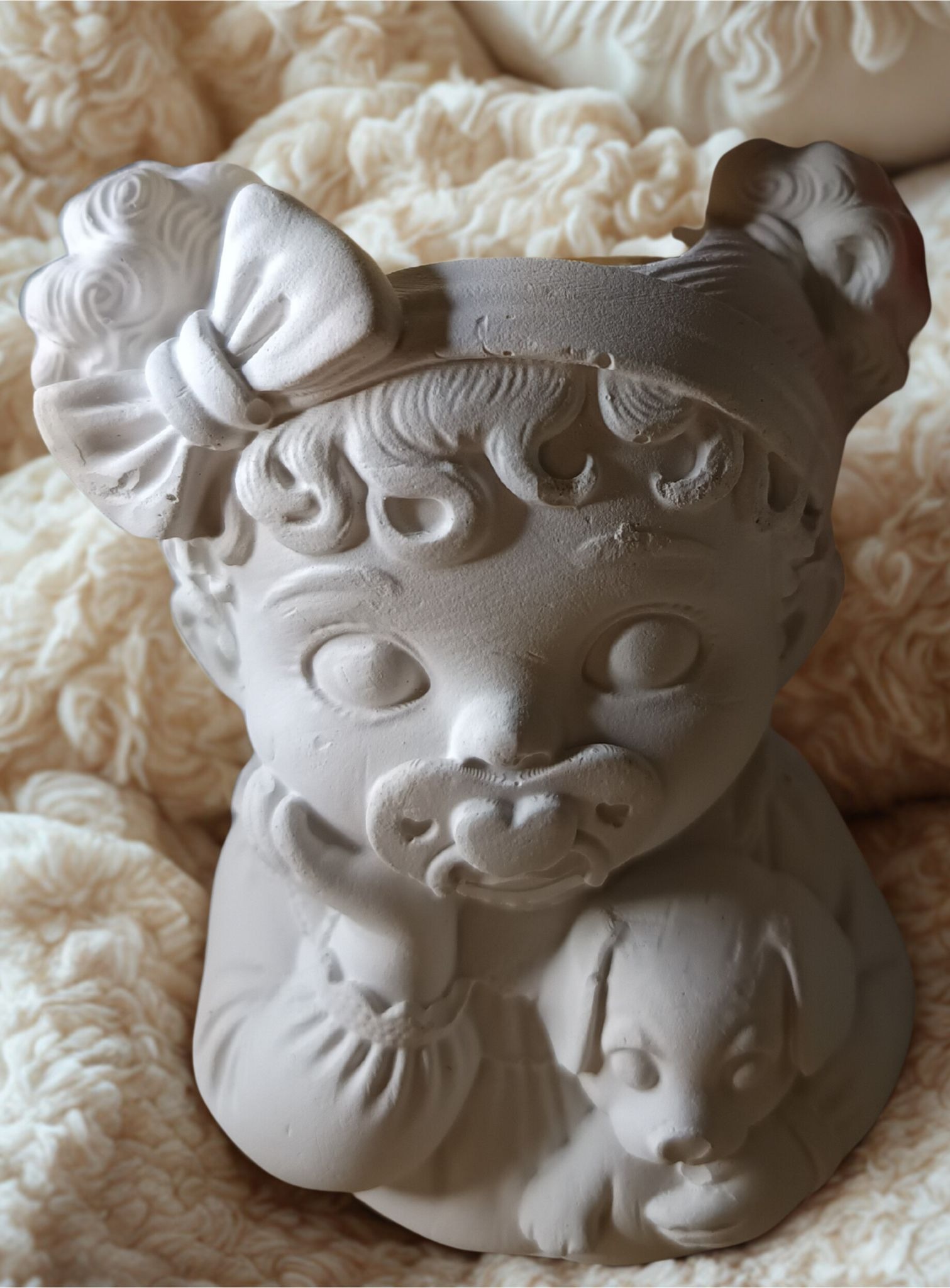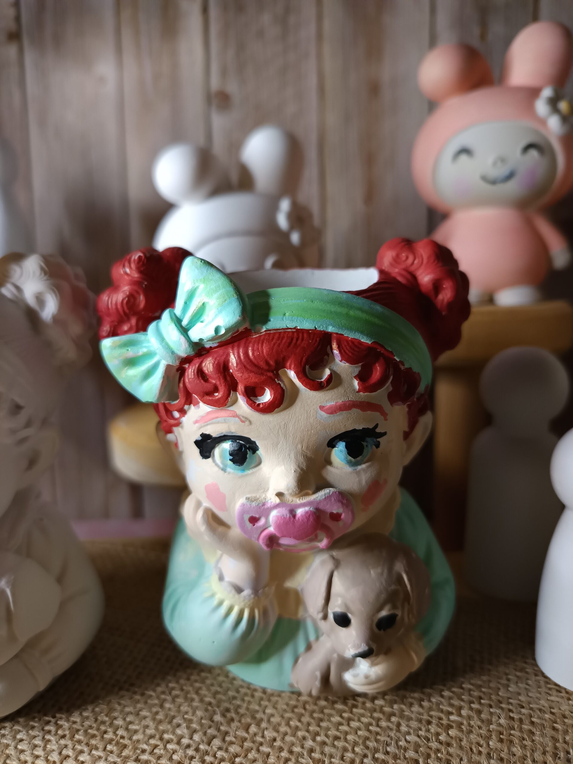 Dieses liebevoll handgefertigte DIY‑Gipsmädchen ist ein kleines Herzensprojekt zum Selbstgestalten. Die Figur zeigt ein liegendes Baby‑Mädchen mit Schnuller und einem kleinen Hund im Arm – ein Motiv, das sofort Wärme und Geborgenheit ausstrahlt. Jedes Stück entsteht in meinem Atelier in Reutlingen und wartet darauf, von dir kreativ zum Leben erweckt zu werden.