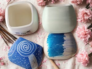 Um euch zu zeigen, wie vielseitig dieses kleine Gefäß sein kann, habe ich ein paar Musterbeispiele gestaltet. Sie zeigen unterschiedliche Techniken – von zarten Pastelltönen über Muster bis hin zu kleinen Farbexperimenten. Diese Beispiele sollen euch inspirieren und Lust machen, euer eigenes Unikat zu gestalten.