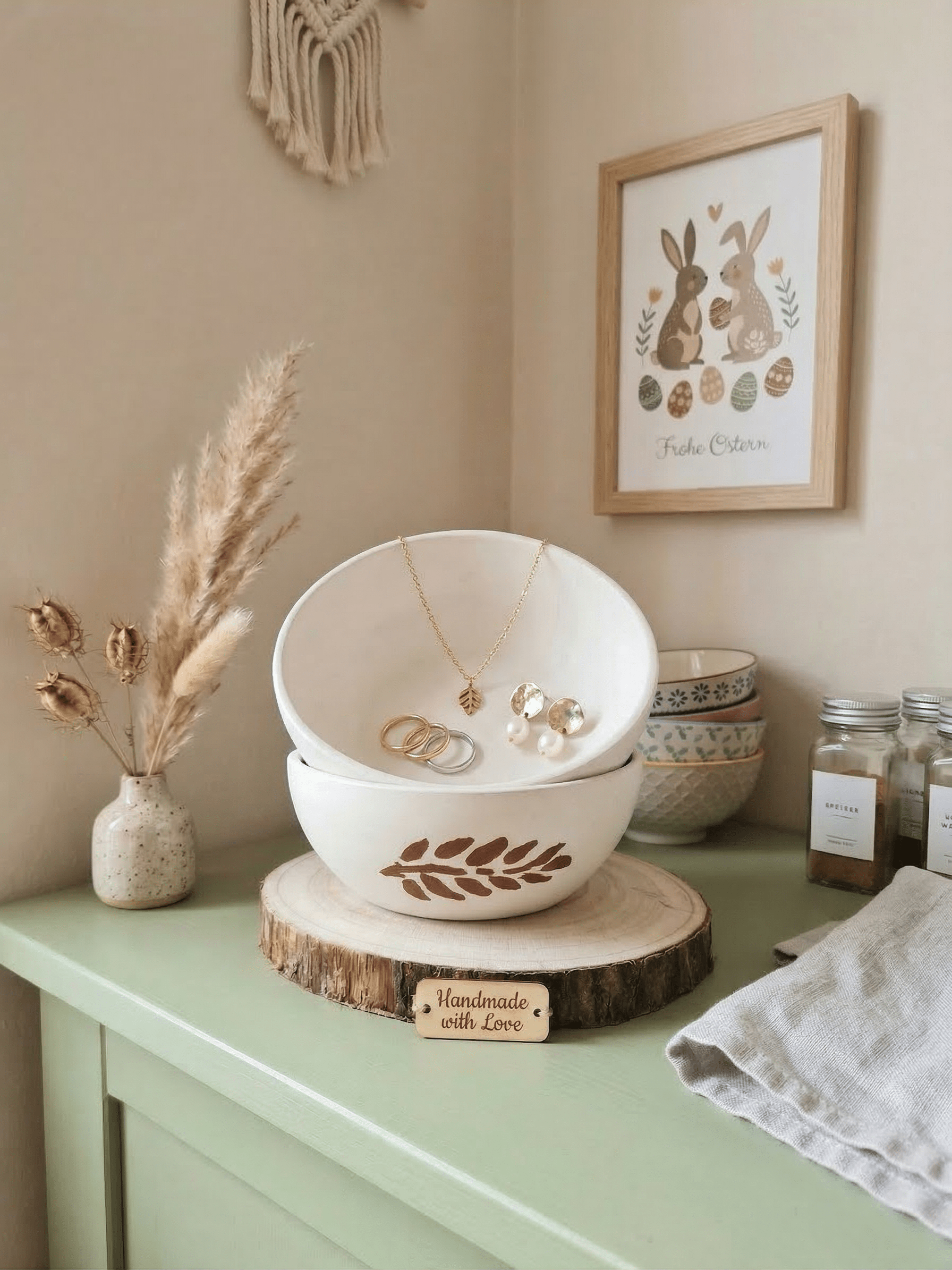 Dieses liebevoll gefertigte Schüssel‑Set entsteht in sorgfältiger Handarbeit in deinem Atelier. Jede Schale wird aus hochwertigem Gips gegossen – je nach Gipsart leicht unterschiedlich in Struktur und Haptik – und anschließend naturbelassen oder zart veredelt. Der handgemalte Zweig auf dem Rand macht jede Schale zu einem kleinen Kunstwerk. Die Farbe des Zweiges kannst du dir ganz nach Wunsch aussuchen, sodass das Set perfekt zu deinem Zuhause oder deinem Geschenk‑Anlass passt.