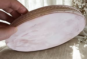 Der Rand ist mit meiner typischen Perlenstruktur versehen, die dem Stück eine sanfte Eleganz verleiht. Die Rückseite habe ich in einem feinen Marmor‑Effekt gestaltet, sodass die Platte auch von unten eine kleine Überraschung bereithält und rundum hochwertig wirkt.