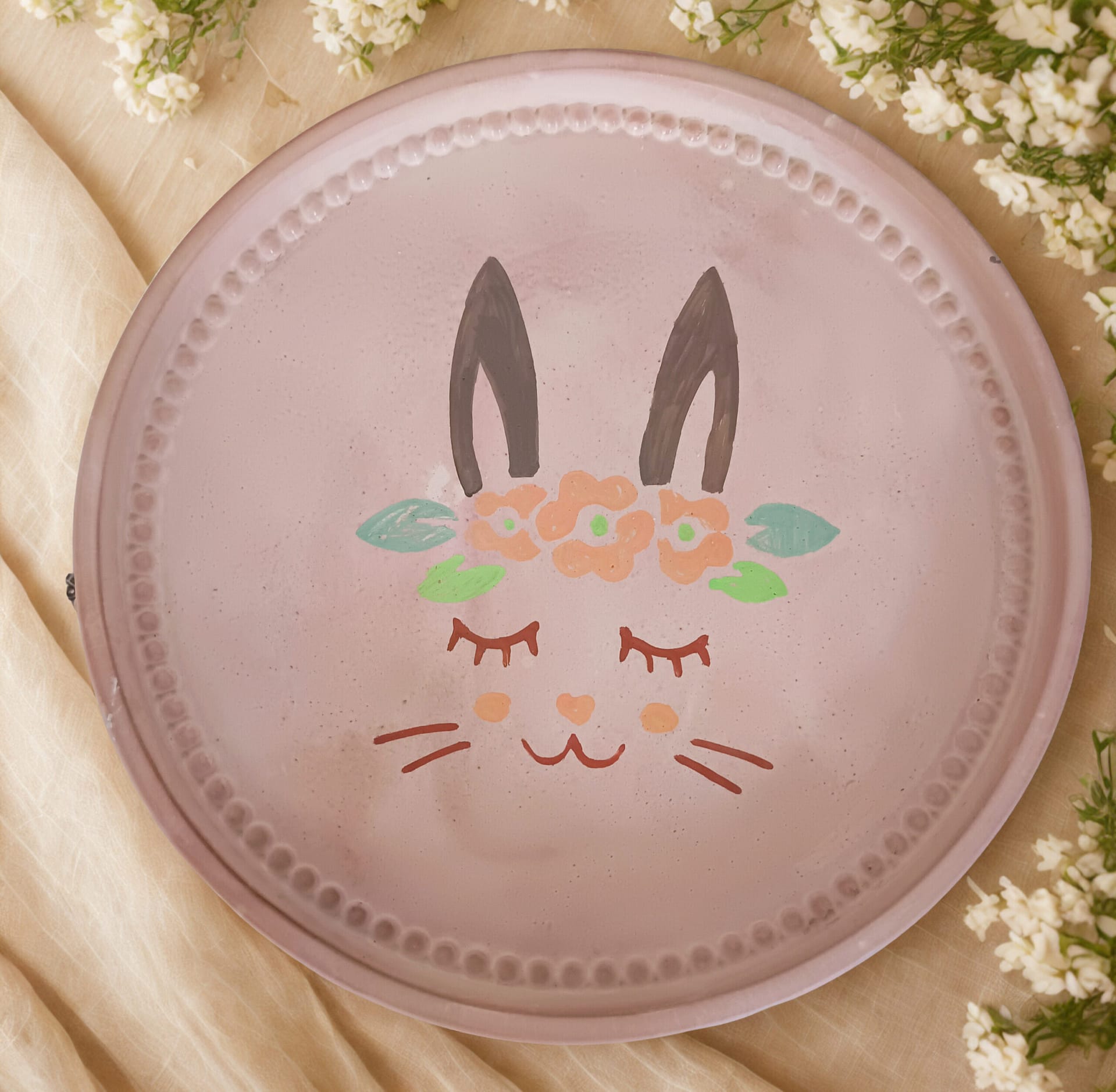 Der Rand ist mit meiner typischen Perlenstruktur versehen, die dem Stück eine sanfte Eleganz verleiht. Die Rückseite habe ich in einem feinen Marmor‑Effekt gestaltet, sodass die Platte auch von unten eine kleine Überraschung bereithält und rundum hochwertig wirkt.