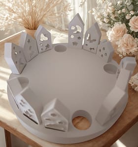 Ein handgefertigter Gipskranz, der den Frühling willkommen heißt: Mit einem Durchmesser von 17 cm bietet er Platz für vier Kerzen in der Mitte und wird von zwölf kleinen Steckhäusern umrahmt – jedes mit liebevollen Details wie Sternen, Wolken oder Bäumen.