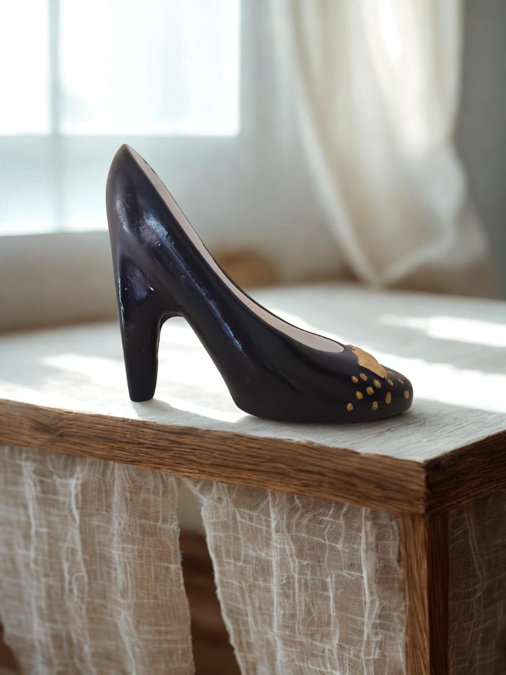 Ein handgegossenes Kunstwerk voller Eleganz: Dieser hochglänzende High Heel aus Gips vereint tiefes Schwarz mit feinen goldenen Akzenten und strahlt feminine Stärke und Boutique-Charme aus. Jeder Schuh ist ein nummeriertes Einzelstück – sorgfältig gefertigt und liebevoll veredelt in deinem Atelier.
