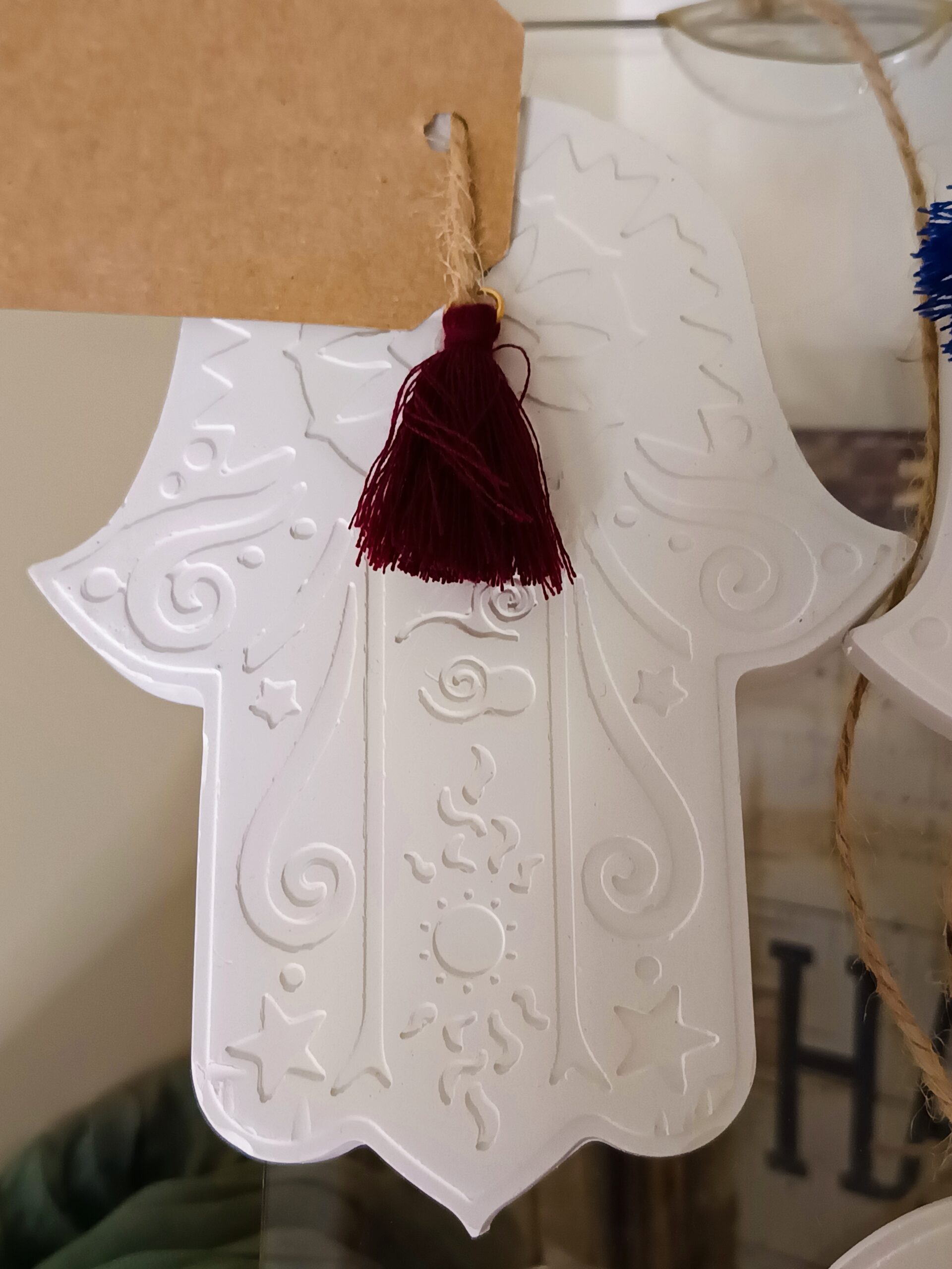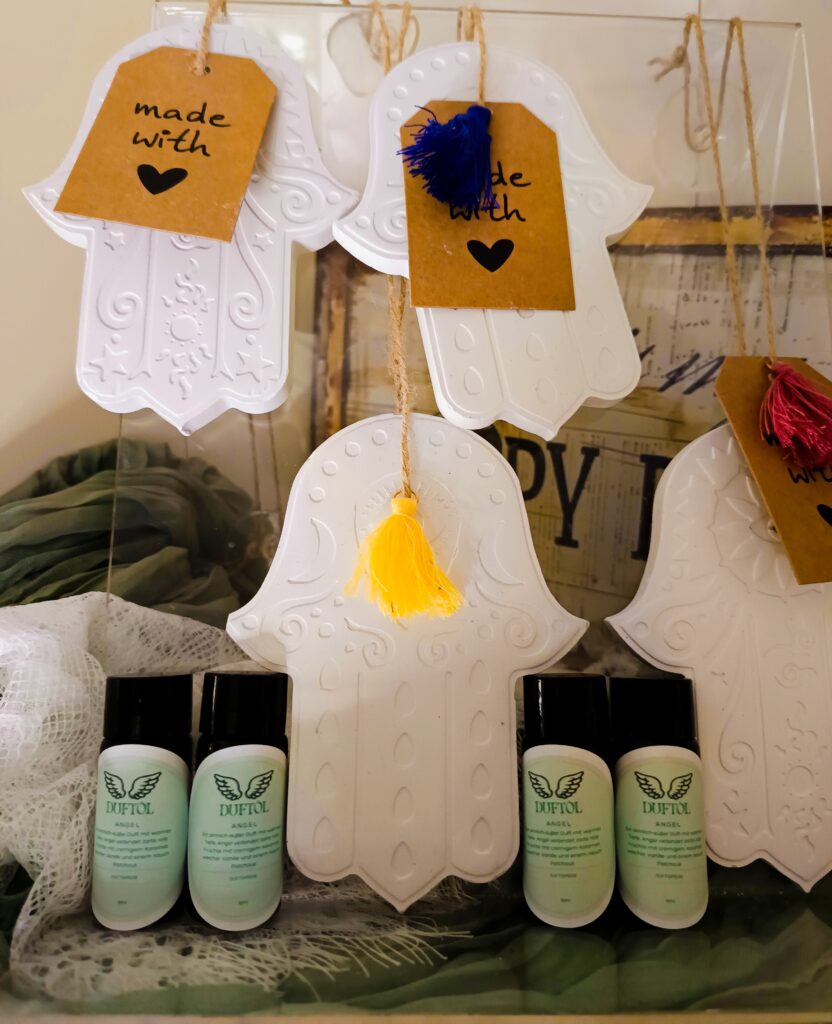 Wichtig: Das Öl bitte auf der Rückseite der Hamsa auftragen. Der Gips nimmt den Duft dort perfekt auf, und die Vorderseite bleibt schön sauber.
