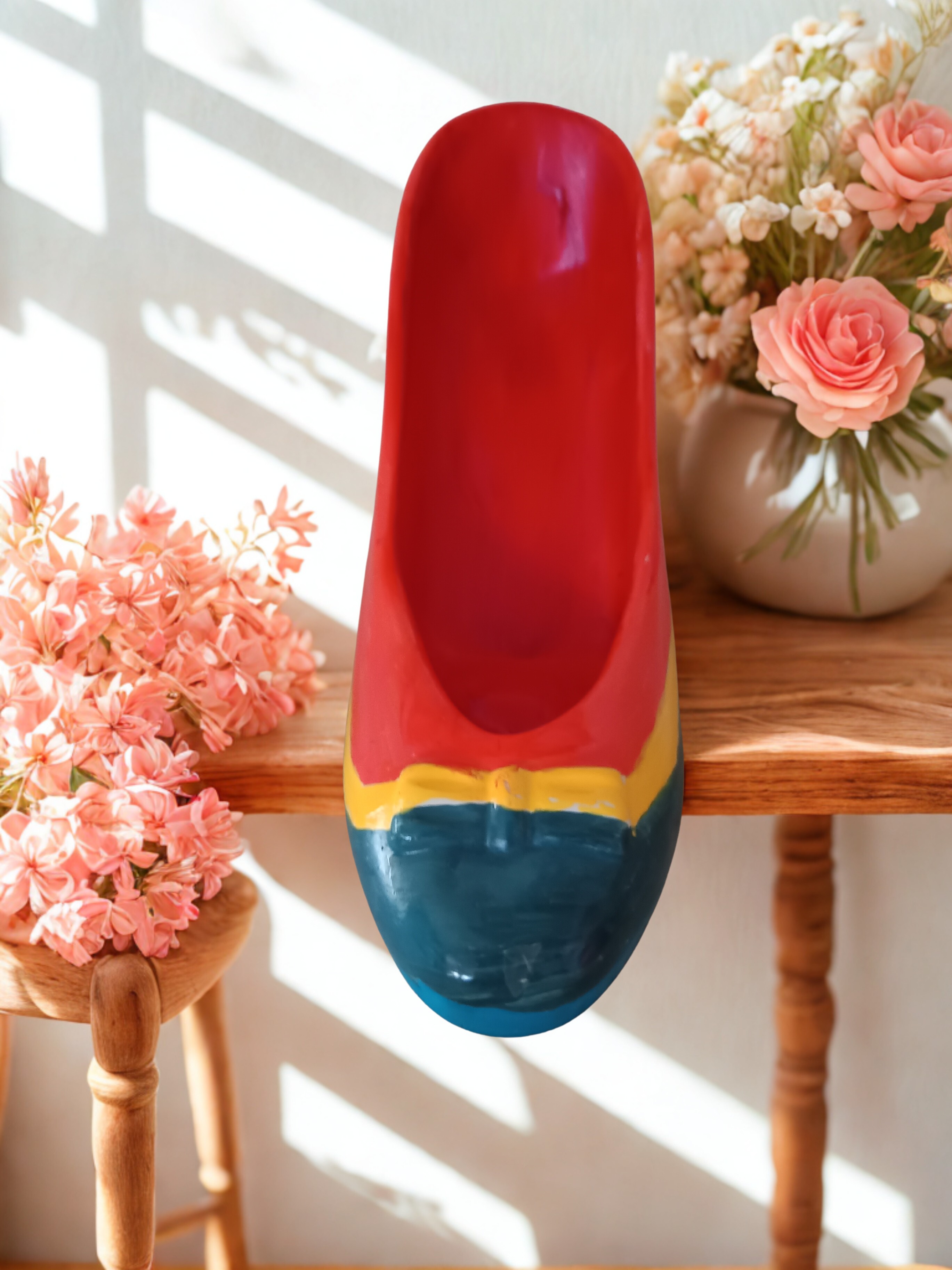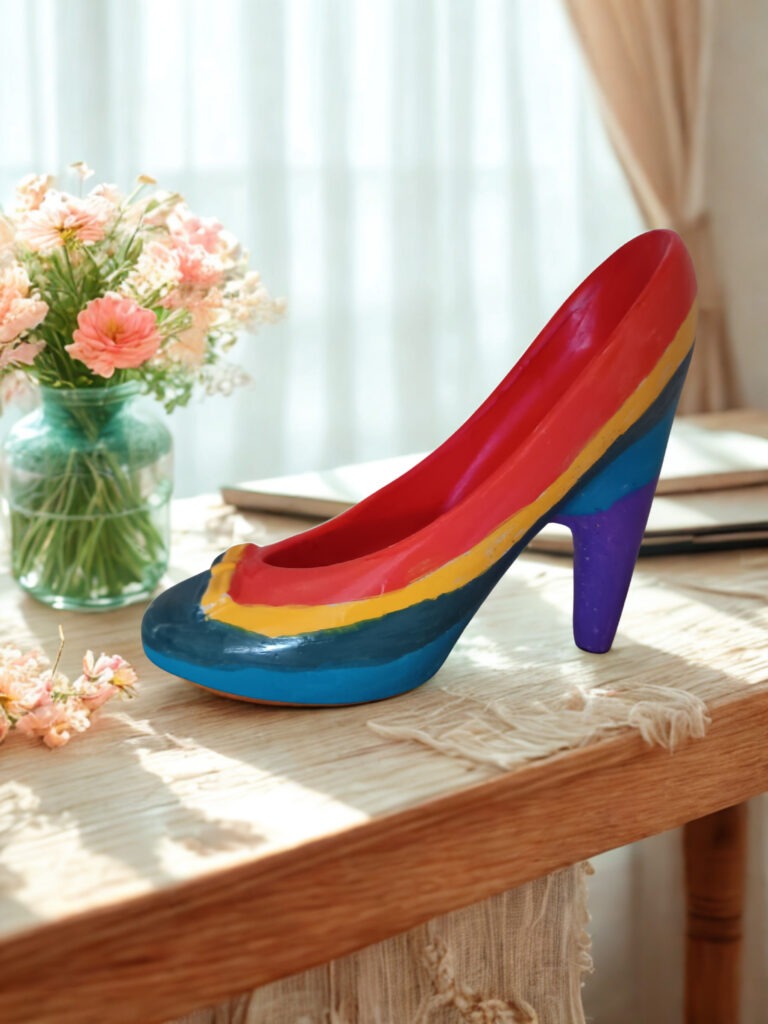 Wie ihr auf dem Foto seht, arbeite ich mit Gips, um diese perfekte, elegante Form Schicht für Schicht herauszuarbeiten. Das Finish bekommt der Schuh durch Acrylfarben in den kraftvollen Farben der Community. Es ist noch ein „Work in Progress“, aber jedes Mal, wenn ich einen neuen Farbstreifen auftrage, muss ich an das Strahlen in seinen Augen denken.